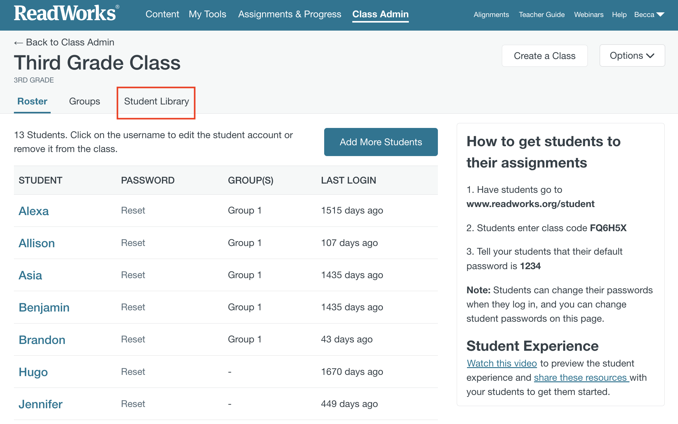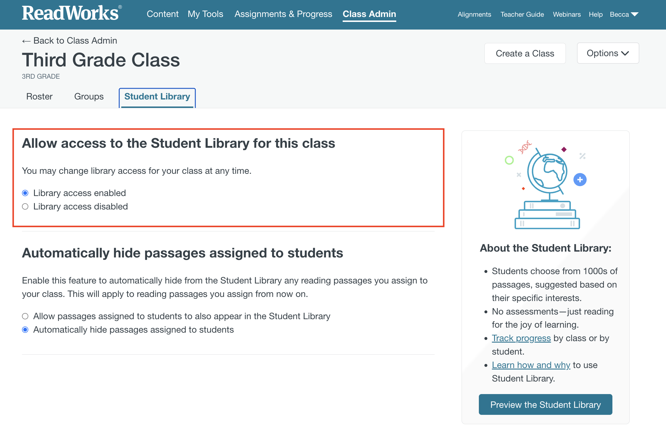 To turn off the Student Library for your digital class, navigate to "Class Admin."