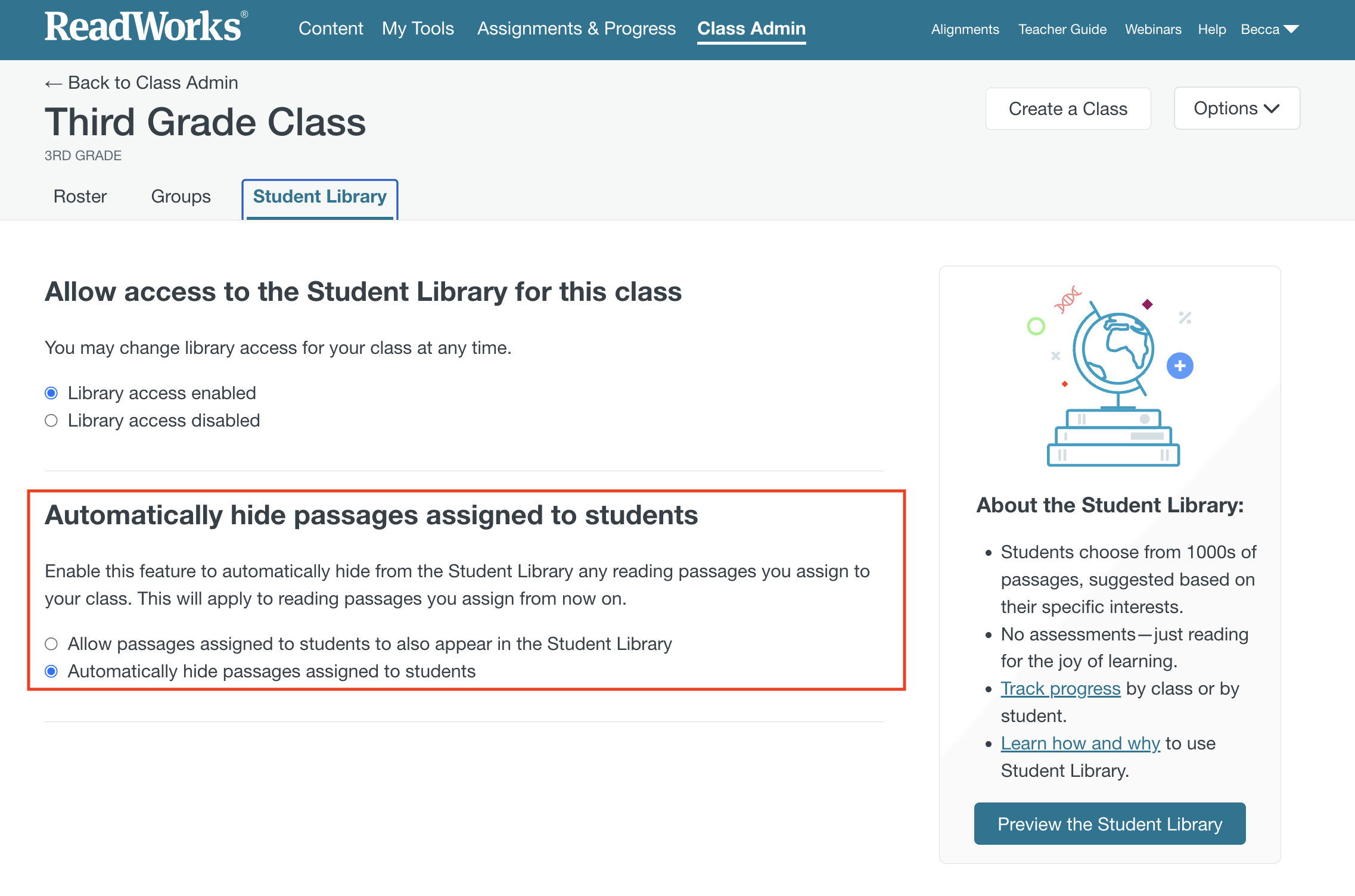To turn off the Student Library for your digital class, navigate to "Class Admin."